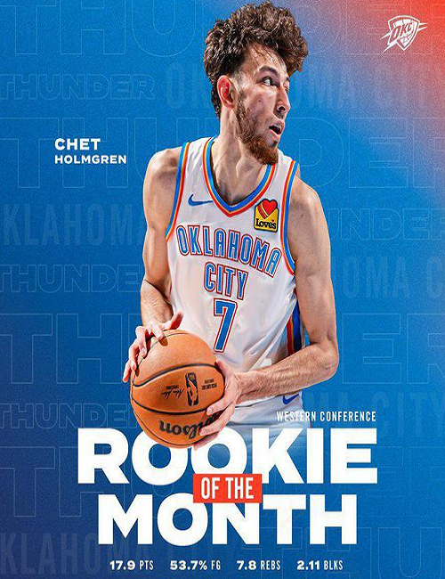 霍姆格伦力压文班亚马,当选了本赛季首次西部月最佳新秀。10-11月的比赛中,霍姆格伦场均贡献17.9分7.8篮板2.6助攻2.1盖帽,投篮命中率53.7%,三分命中率41%,罚球命中率87.1%。雷霆官方晒海报祝贺他获奖。