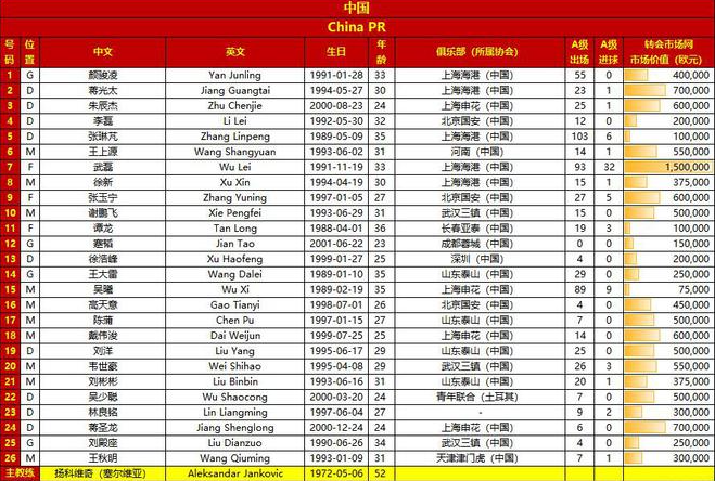 亚洲杯卡塔尔和中国26人大名单