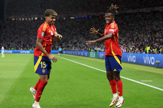 西班牙(4231):23-乌奈-西蒙/2-卡瓦哈尔、3-勒诺尔芒(83'4-纳乔)、14-拉波尔特、24-库库雷利亚/16-罗德里(46'18-祖比门迪)、8-法比安-鲁伊斯/19-亚马尔(89'6-梅里诺)、10-奥尔莫、17-尼科-威廉斯/7-莫拉塔(68'21-奥亚萨瓦尔)